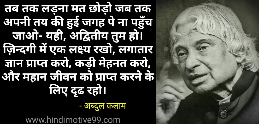 तब तक लड़ना मत छोड़ो जब तक अपनी तय की हुई जगह पे ना पहुँच जाओ- यही, अद्वितीय तुम हो। ज़िन्दगी में एक लक्ष्य रखो, लगातार ज्ञान प्राप्त करो, कड़ी मेहनत करो, और महान जीवन को प्राप्त करने के लिए दृढ रहो।